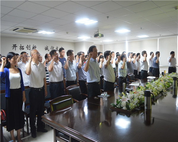会议进行第一项,全体人员起立,唱国歌。嘹亮高昂的义勇军进行曲响彻整个会议室、整个集团公司,歌声振奋同志们的意志,更加坚定了对党的信仰。