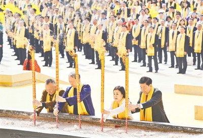 当日上午,黄帝故里园区旗幡猎猎、庄严肃穆。南门广场上,龙腾虎跃,鼓声震天。寓意着中华儿女来自五湖四海的540名炎黄子孙,分别组成各90人的文化方阵、岐黄方阵、企业方阵、同拜方阵、台胞方阵、侨胞方阵六大拜祖队伍,整肃衣冠,佩戴黄帝丝巾,进寻根门、经系祖坛、上轩辕桥、过故里祠,观甲骨碑林方柱高举,感杜岭方鼎王者风范,听青铜编钟古音缭绕,最后缓步来到拜祖广场,端详两侧连廊浮雕,感触中华文明五千多年的源远流长。