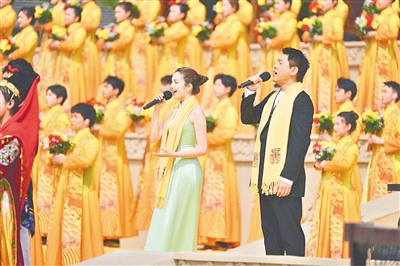 高唱颂歌。来自香港地区的钟镇涛、台湾地区的朱孝天和澳门地区的麦嘉欣以及内地的曹芙嘉,与56个民族的少年儿童一起,同歌《黄帝颂》,共聚家国情。
